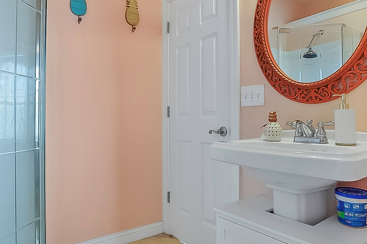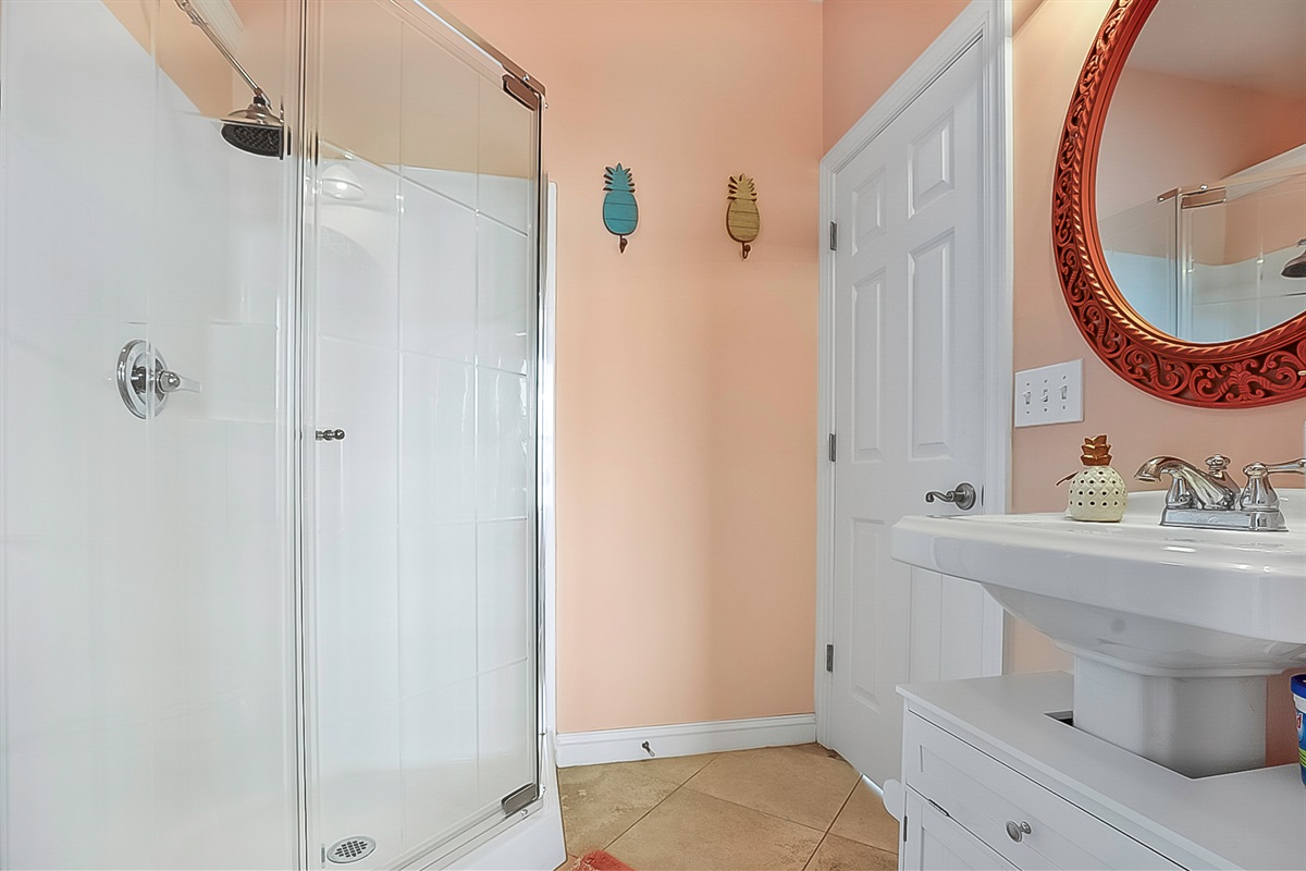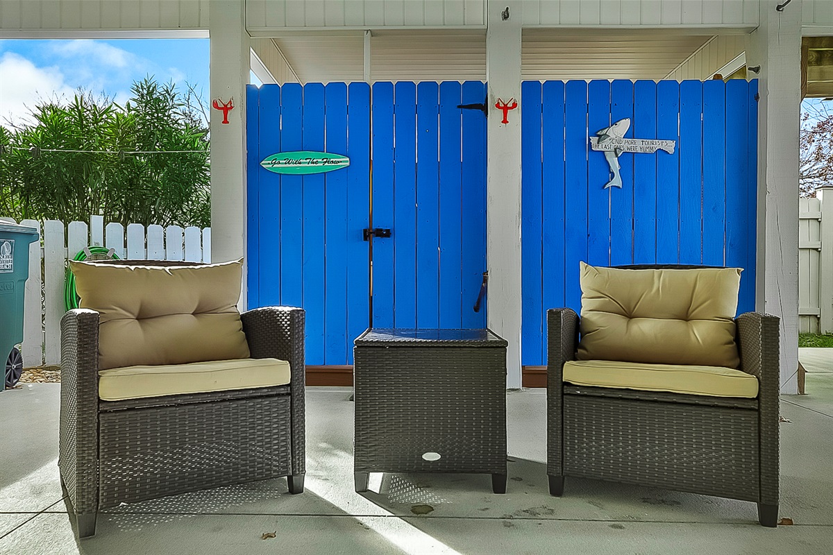 Ground Floor has a small room w/ comfortable seating w/ flat screen TV (Queen sleeper sofa w/ foam topper), plus access to the covered car port & outdoor showers & back yard. This level also has a furnished deck w/ picnic table, umbrella, Adirondack chairs, bench seating & lounge chairs for the whole group to take in the summer breezes. An outdoor shower is well-furnished with 2 shower heads, sink & toilet for easy access from the pool.