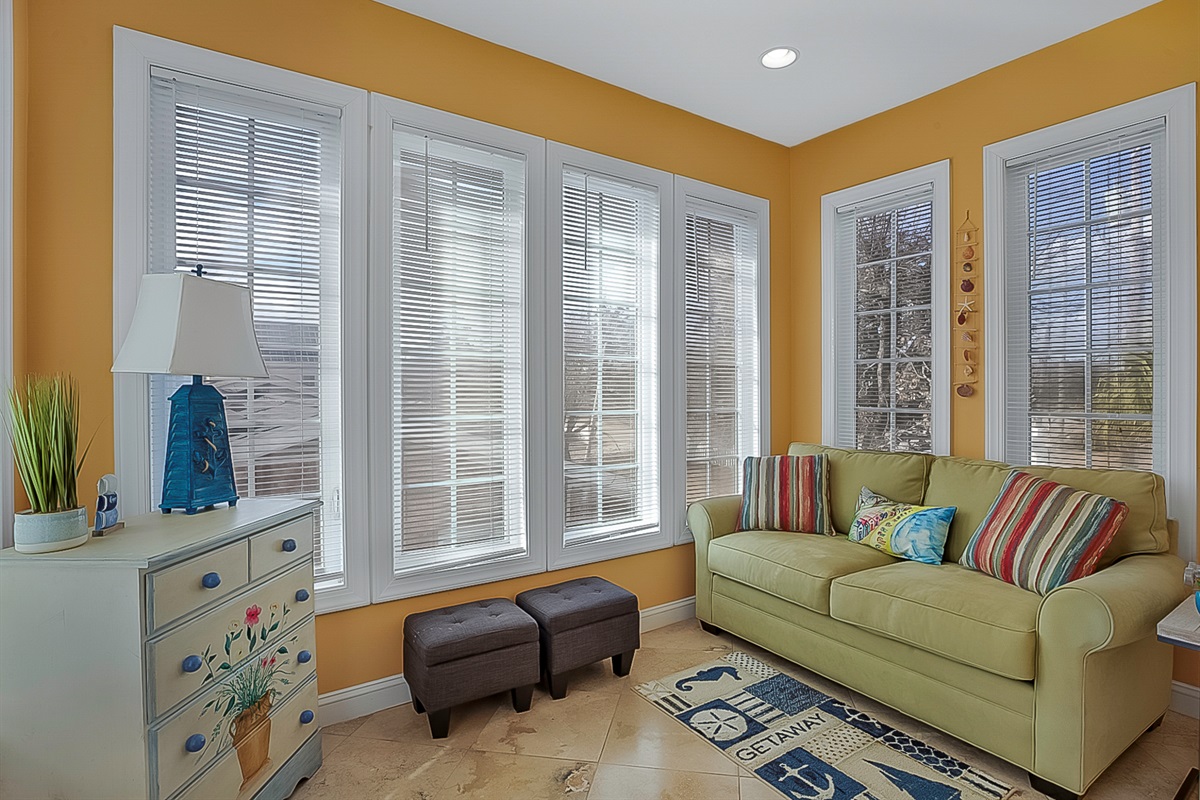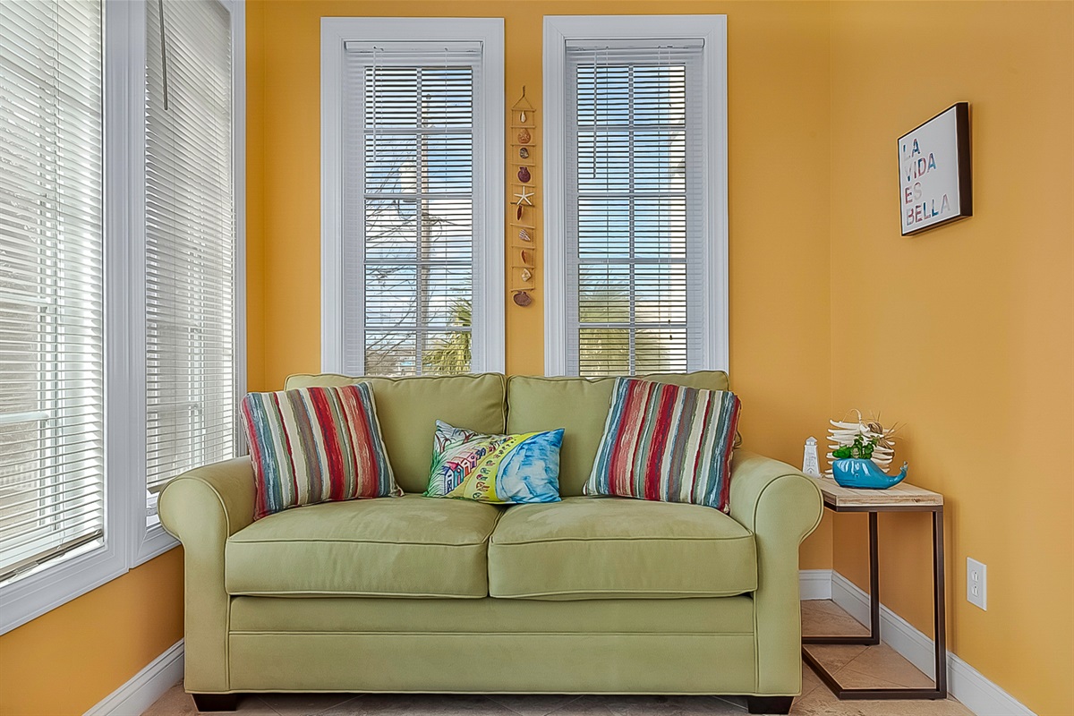 First floor (upstairs) is an open floor plan w/ living room, kitchen & dining area (seating for 6, plus 2 barstools), bonus sun room with small love seat. Sectional seating w/ flat screen tv for streaming on family nights. A Queen bedroom is located on this first floor w/ direct bathroom access (shower only/NO tub) but also shared with downstairs.