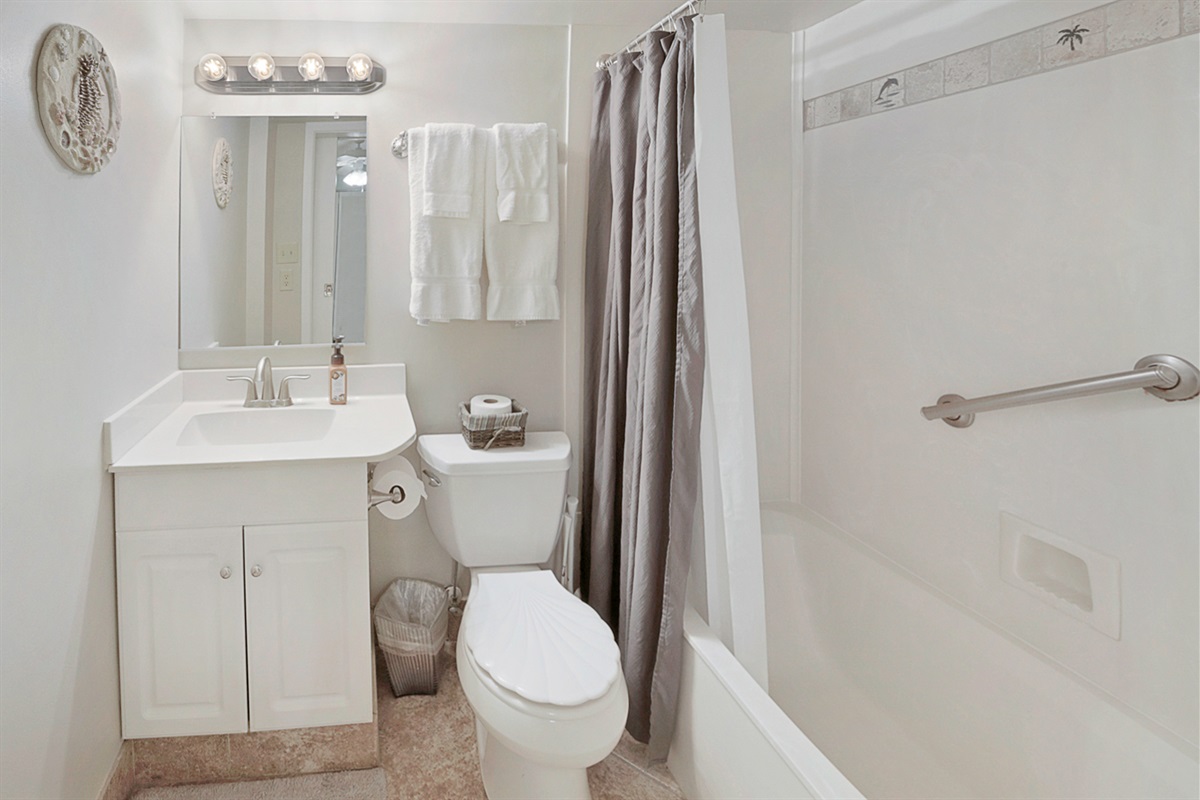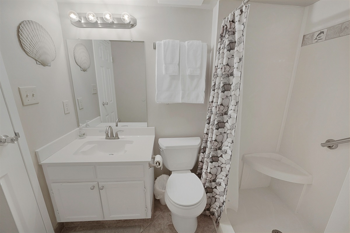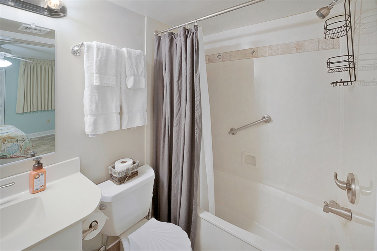 The oceanfront master bedroom (King) has a private e-suite bathroom (shower stall) with an extra dressing vanity for her. Flat screen TV and access to the balcony for coffee in the morning. The second guest bedroom (Queen) is spacious with it's own private bathroom (shower stall). The third bedroom (Twins) is kids retreat with a full tub/shower combo bathroom (shared hall bath). Both guest rooms also have flat screen TVs. The condo is stocked with kids games, of course, FREE wi-fi, too.