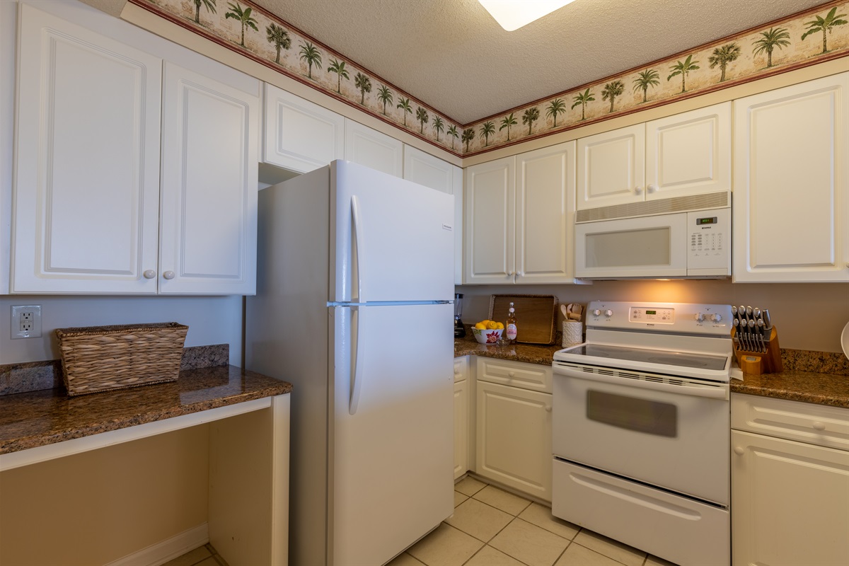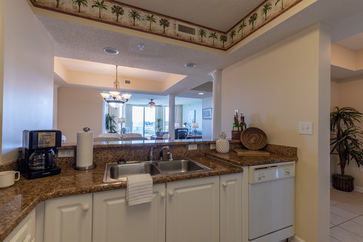 The fully appointed kitchen features granite countertops, fridge, ice maker, glass top stove/oven, microwave and dishwasher. There are dishes, silverware, a complete set of pots and pans and food preparation utensils. The kitchen also come complete with toaster, blender, hand mixer and coffee maker. Spacious new dining table with chairs for 6 and 3 br stools.