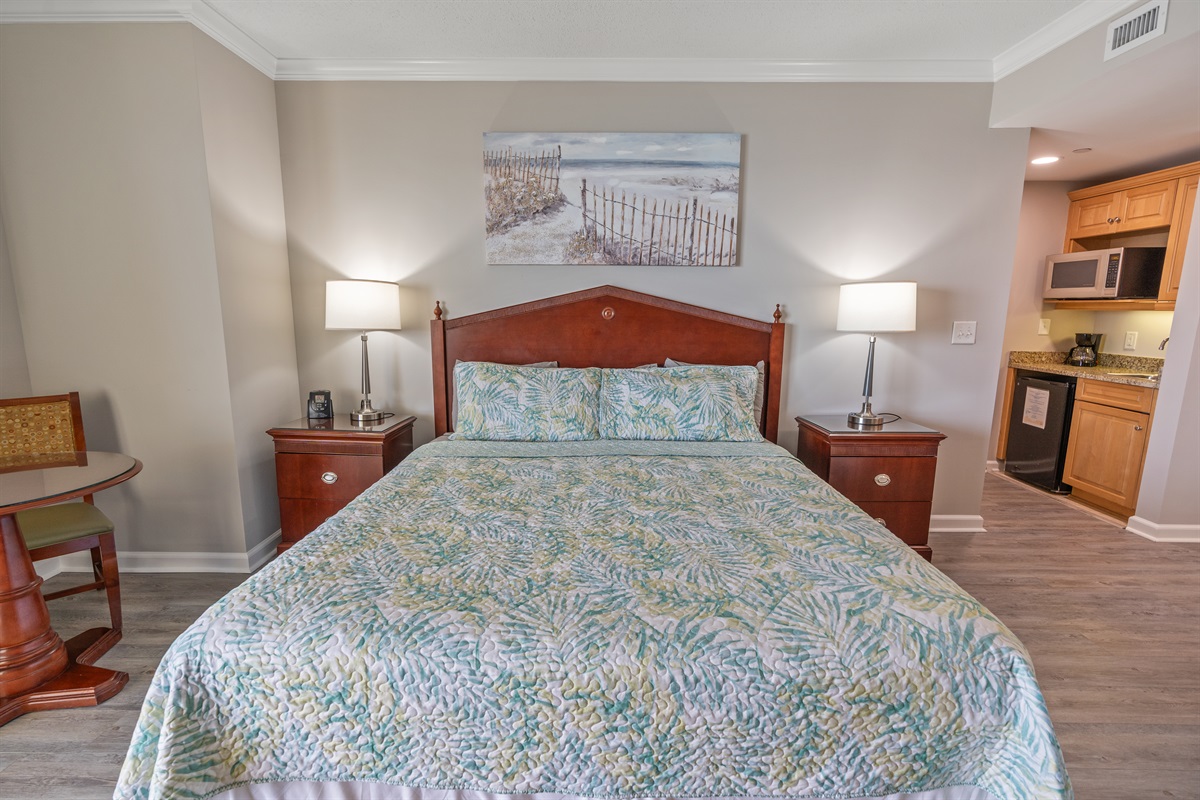 1 Bathroom 1 Bath • Sleeps 1-2Ocean view studio on the 24th floor (penthouse) of the Royale Palms, connected to Hilton. Updated with new LVP flooring, new beds, freshly painted and new art work. Enjoy Ocean views all the way to downtown Myrtle Beach. The sunset views are amazing! This is the perfect escape from day-in, day-out humdrum! Furnished with a king size bed and desk area, you'll also have a coffee maker, coffee, sugar and cream, microwave and small fridge and kitchenette. For an additional fee, this condo can be rented with Unit #2406 next door to create a 3 BED / 3 BATH combo for extra guests.